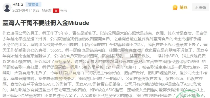 據了解,日前外匯天眼有位用戶在發文爆料MiTRADE,他自稱是該平台的員工,在裡面工作了3年多,原本公司最大的市場是越南與泰國,在2022年的每月用戶數有7.5萬,但到了今年就剩不到3萬,業績因此嚴重下滑。
